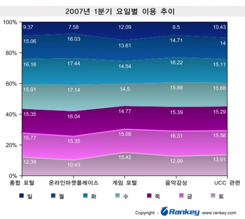 - 음악감상 분야의 2007년 3월 일평균 방문자수는 약139만 여명으로 지난해 3월에 비해 3.85% 감소하였다.