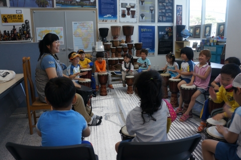 - 헬로우 아프리카와 놀자전에서 전문강사로부터 젬베체험교육을 받고있는 모습이다.