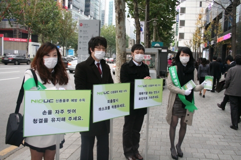 - (주)컨퍼넥스 직원이 출근 시간에 플루 확산 방지를 위하여 마스크와 예방 요령이 인쇄된 전단지를 배포하고 있다.