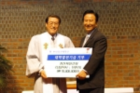 - 5월 16일 분당동문교회 손세용 목사(왼쪽)가 한일장신대 정장복 총장에 1천만원을 기탁하겠다는 뜻을 밝혔다.
