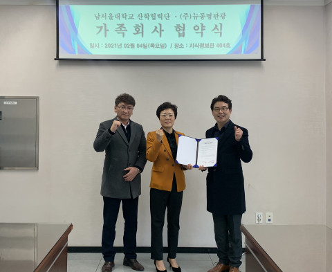- 이미경 뉴동명관광 대표(가운데)와 황규일 남서울대 교수(오른쪽)가 재직자 위탁 교육, 대학 컨벤션 시설 이용 등을 위한 산학협력식에서 기념 촬영을 하고 있다