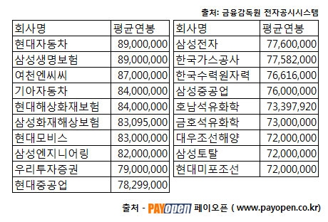 - 금융감독원의 전자공시자료를 분석하여 매출액 기준 상위 100대 기업 중 임직원 평균연봉이 7200만원 이상인 기업들을 정리한 표