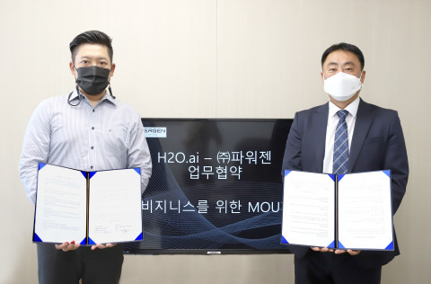 - 왼쪽부터 유효정 H2O.ai 한국지사장과 파워젠 이정규 대표가 협약식에서 기념 촬영을 하고 있다
