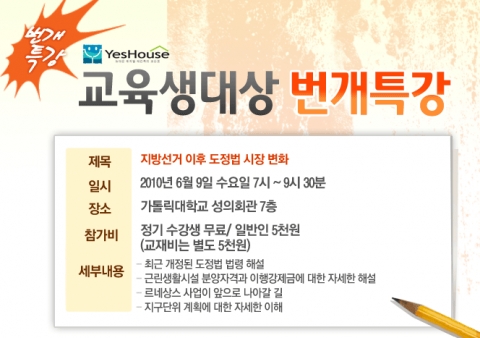 - 예스하우스 뉴타운 재개발 투자스킬 과정, 51기부터 한양대· 경기대·가톨릭대 사회교육원에서 진행