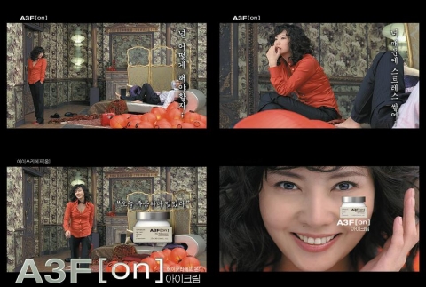 제품에 대한 일방적인 메시지 보다는 여자의 마음을 통해 주름과 헤어질 수 있다는 아이크림의 효능을 절묘하게 매치 시킨 A3F[on] 아이크림 광고. 딱 15초 만으로도 여성의 마음을 흔들어 놓기에 충분하고, 마지막 엔딩 컷에서 주름과 헤어진 김남주의 환한 미소가 주름개선 기능성 화장품으로써의 대표 브랜드인 A3F[on]의 제품력에 대한 강한 자신감을 돋보이게 한다.