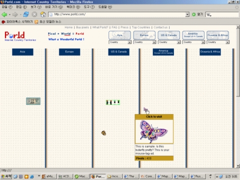 전세계 각국의 사이버 영토를 판매한다는 풜드(porld.com)라는 웹사이트가 생겼다. 물론 실제 각국 영토가 아니다. 픽셀을 가상적인 영토라고 치환해서 판매하는 셈이다.