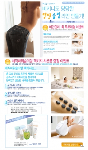 비만을 막고 더욱 예뻐지고 군더더기 없는 아름다운 몸매를 위한 비만관리 무료체험과 매직파워슬리밍 패키지 구입 시 사은품으로 매직파워 슬리밍 3종 세트를 무료로 증정하는 이벤트를 실시하고 있다.