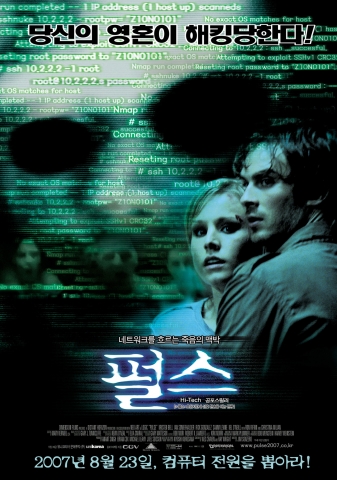 8월 23일 개봉을 앞두고 공개된 <펄스>의 포스터는 하이테크 공포스릴러라는 장르의 특성에 맞게 복잡한 도스언어와 수식으로 얽힌 컴퓨터 화면 속 드러난 귀신 형상을 통해 공포감을 극대화 하고 있다. 컴퓨터 속에 죽은 자의 영혼이 살고 있다는 영화의 모티브를 잘 드러내고 있는 부분이다.