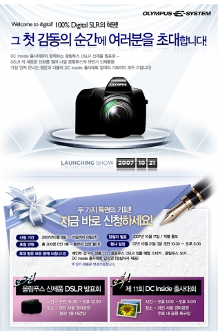 행사 초청인원은 10월 9일부터 15일까지 회사 홈페이지(www.olympus.co.kr)에 ‘올림 푸스 DSLR 신제품 설명회’와 ‘디시인사이드 출사대회’에 참석하고자 하는 이유를 작성하여 응모한 사람 중 300명을 선발한다.