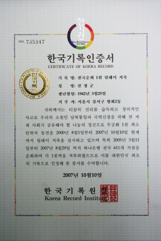 한국기록원에 따르면 “진씨는 현재 장롱 속에 잠자고 있는 동전을 깨워 기부를 통한 나눔 문화 확산 캠페인 퍼포먼스로 ‘세계에서 가장 큰 동전 태극기’를 내년 3월 완성을 목표로 만들어 기네스세계기록에 도전을 진행 중에 있다”고 말 하였다.