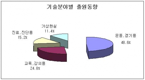 이 분야의 출원을 기술 분야별로 살펴보면, 인터넷을 이용하여 네트워크 게임처럼 다른 사람과 경기를 통해 운동을 하는 운동·경기용(49%)분야, 인터넷 강의처럼 실연자의 동작을 전송받아 피드백 교육이 이루어지는 교육·강의용(25%)분야, 운동량 등의 정보와 맥박 체온등의 정보를 입력 받아 이용자의 건강상태를 체크하거나 적합한 운동을 추천하는 진료·진단용(15%)분야, 실제현장에서 운동을 하는 듯한 효과를 주어 동기부여가 가능한 가상현실 구현(11%)분야 등으로 나눌 수 있으나(붙임 2), 이 중 진료·진단용(15%)분야는 외국인 출원이 다수를 차지하는 반면, 내국인 출원은 운동·경기용 분야와 가상현실 분야가 주를 이루고 있어 진료·진단용 분야 등의 출원은 저조한 편이다.