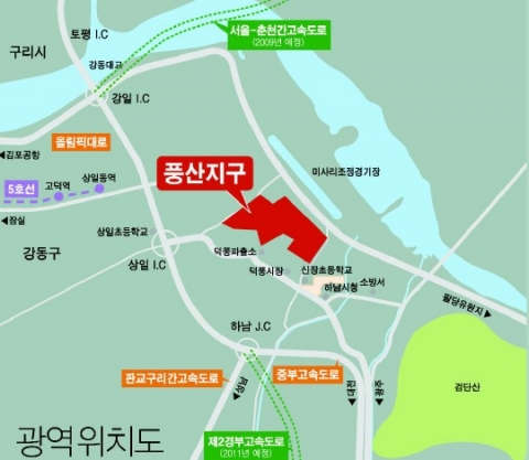 경기 하남 풍산지구는 물과 녹지로 특화된 생태환경도시‘워터그린시티’로 개발될 예정이다. 토지공사는‘도시미래 이미지구상’과 ‘환경생태도시 조성’용역 결과를 반영해 풍산지구에 한강 물이 흐르는 실개울, 물과 자연을 감상할 수 있는 시각공원, 시각ㆍ청각ㆍ후각ㆍ미각ㆍ촉각 등 인체 5감을 주제로 한 테마공원을 조성할 예정이다.
