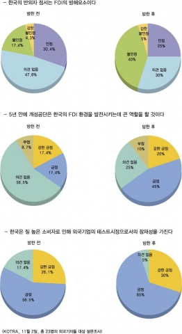 한편, 한국투자환경의 장애요소로 인식되고 있는 투자제한, 반외자정서, 강성 노조 및 정부규제 문제에 대해서도 비교적 긍정적인 인식을 하고 있었다. 특히 반외자정서 문제와 규제 문제에 대해서는 방한 전과 방한 후의 인식이 많이 개선된 것으로 나타났다.
