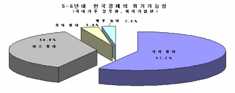 전경련이 국내 외국대사관의 상무관과 외국기업인 100명을 대상으로 조사한 ‘한국주재 외국경제인들의 우리나라 대외경쟁력 전망’ 보고서에 따르면, 국내 거주 외국경제계 인사들의 39.3%가 5~6년 내 한국경제가 어려운 상황을 맞을 수 있다는 견해에 ‘그럴 수 있다’고 응답했다.
