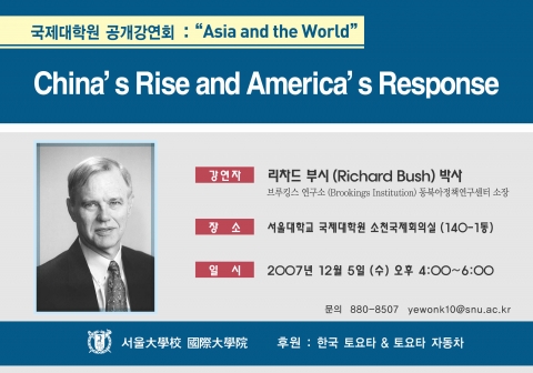 이번 공개 강좌는 미국 브루킹스 연구소 동북아정책연구센터의 리차드 부시 박사를 강사로 초청하여「중국의 부상과 미국의 대응」이라는 주제로 실시될 예정이다.