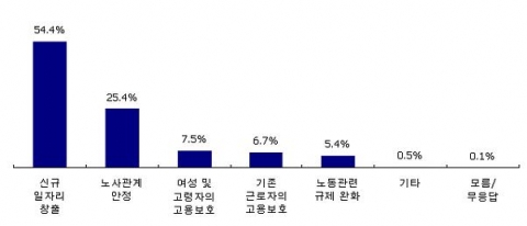보고서에 따르면, 차기 정부가 노동 정책의 최우선순위로 두어야 할 사항으로는 신규 일자리 창출(54.4%), 노사관계의 안정(25.4%), 여성 및 고령자의 고용보호(7.5%), 기존 근로자의 고용보호(6.7%) 등의 순서로 나타났다. 이는 국민들이 정부에 대해 가장 크게 기대하는 바가 새로운 일자리를 만들어 주는 것이라는 사실을 반영하는 것이다.