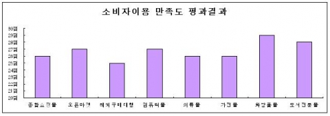 평가분야별 우수업체는 소비자보호평가(50점)에서 여인닷컴(48점), 소비자이용 만족도 평가(40)에서는 삼성카드몰(30점)과 스킨알엑스(30점)가 선정됐고 소비자이용 만족도 평가분야에서는 종합쇼핑몰(26점)에 비해 전문쇼핑몰인 도서전문몰(29점)과 화장품몰(28점), 오픈마켓(27점)의 만족도가 높게 나타난 반면 해외구매대행(25점)은 상대적으로 이용만족도가 낮은 것으로 조사됐다.