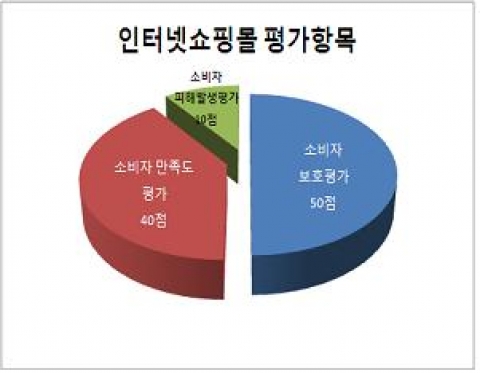 이 조사는 지난 10. 25일부터 4주 동안 소비자들의 접속횟수를 기준으로 선정한 100개 인터넷쇼핑몰(종합쇼핑몰 50개, 오픈마켓 6개, 해외구매대행 5개, 컴퓨터몰 10개, 의류전문몰 10개, 가전몰 10개, 화장품몰 5개, 도서몰 4개)에 대하여 소비자 4,000명(쇼핑몰별 40명)을 대상으로 실시했으며 3개 평가분야는 소비자 보호평가(50점), 소비자이용 만족도 평가(40점), 소비자피해발생 평가(10점)가 있으며 100점 만점을 기준으로 했다.