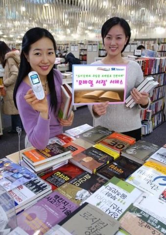 한편, 지난 2005년 첫 선을 보인 SK텔레콤 모바일서점은 무선인터넷 네이트를 통해 도서검색 및 구입, 배송주문까지 가능한 서비스다. 기존 온라인서점의 장점과 휴대폰의 편리함을 접목했으며 교보문고, 인터파크, 알라딘, 예스24 등 국내 4대 온라인서점이 모두 입점해 있다. 이 서비스는 휴대폰에서 **7474+NATE 또는 통화버튼을 눌러 접속하면 이용할 수 있다.