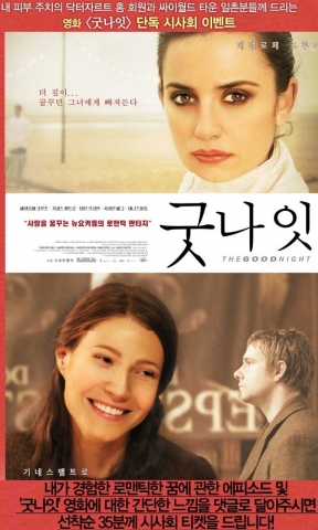 영화 ‘굿나잇’은 매일밤 꿈속에서 만나는 그녀와 현실에서의 연인 사이에서 사랑의 의미를 찾아가는 뉴요커들의 로맨틱한 판타지 영화로 기넬스 펠트로와 펠넬로페 크루즈가 출연한다.
