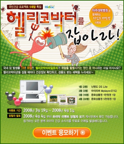 ‘헬리코박터파일로리를 잡아라!’ 이벤트는 3월 19일부터 4월 1일까지 진행되며, 응모한 분께는 추첨을 통해 닌텐도DS lite, 아이리버 미키mp3, 문화상품권 등을 제공한다.