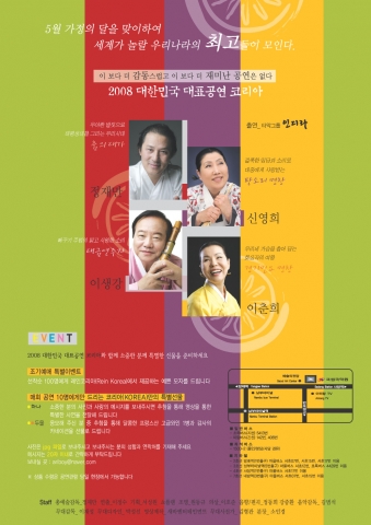 우리시대 최고의 명인 정재만, 이생강, 신영희, 이춘희 선생과 타악그룹 인디라가 대중에게 사랑받고, 세계인에게 호평 받을 수 있는 대한민국 대표예술 공연을 만들고자 한 자리에 모였다.