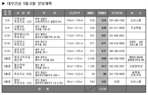 지난 1/4분기 동안 분양시장을 예의주시하며 시장동향 분석에 주력해 왔던 대우건설은 최근 입지가 뛰어나거나 분양가가 저렴한 단지, 틈새 투자상품으로 부각되고있는 오피스텔에는 지속적인 수요가 몰리고 있는 것에 주목하고, 5월과 6월 두 달 동안 동탄 신도시, 인천 등 수도권 요지와 광주, 울산, 청주 등 총 9개 사업지에서 아파트와 오피스텔, 타운하우스 등 5,070세대를 분양한다.