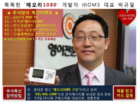 참여방법은 휴대폰 열고 “메모리1080 구입”이라고 입력한 후, 031-941-3399로 문자메시지를 전송하면 완료되며, 관련 TM상담원이 간단한 전화상담을 통해 구입이 확정되면, 제품 및 2GB SD 메모리 카드를 제공하고, 제품을 수령한 후, 카드결제를 하면 완료되고, 9.9일에는 구입고객에 한해 또 한번의 PHP 42" TV 등의 경품추첨이 기다리는 빅이벤트가 준비되어 있다고 한다.