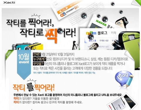 ‘작티를 찍어라’ 이벤트는 산요의 작티 모델을 촬영한 컨텐츠를 자신의 미니홈피, 블로그에 올리는 이벤트로, 산요 작티를 직접 촬영한 컨텐츠 외에 작티의 광고나 신문, 잡지 등이 소개된 작티를 촬영한 컨텐츠도 응모가 가능하다. 응모자 중 우수 컨텐츠를 선발하여 산요 HD 듀얼카메라 작티 VPC-TH1 1대, 공기청정기 1대, 산요 에네루프 전기 충전식 손난로 6대, 삼각대 10개 등을 경품으로 제공한다. ‘작티를 찍어라’는 기존에 진행된 구매 고객 대상의 이벤트와는 달리, 작티 브랜드를 가지고 있지 않더라도, 카메라를 소지한 소비자는 누구나 참여가 가능한 행사라는 점에서 의미가 있다.