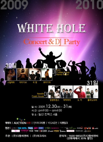 ‘화이트홀 콘서트 앤 파티’는 대형콘서트와 클럽파티가 결합된 새로운 개념의 공연문화이다. ‘쉬즈 곤’으로 우리에게 친숙한 스틸하트(Steelheart)의 메인보컬 마티예비치와 세계적인 기타리스트 토키기타(Tomikita), 이번 공연을 통해 첫 내한공연을 갖게 되는 美애틀랜타 힙합듀오 잉양트윈스(Ying Yang Twins)가 공연을 갖는다. 여기에 최근 최고의 주가를 올리며 맹위를 떨치고 있는 리쌍과 타이거JK, DJ 투컷의 군 입대로 3년간 콘서트 계획이 없는 에픽하이, 도끼(Dok2)와 플래닛쉬버 등이 30, 31일에 각각 출연한다. 클러버랭즈, 마르코네이션, 프릭하우즈, 니들, 주 등 홍대 압구정 등에서 널리 알려진 국내외 클럽 DJ들도 함께 출연하여 환상적인 클럽음악의 세계로 인도할 것이다.