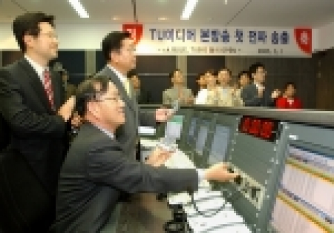 )--TU미디어는 1일 성수동 방송센터에서 서영길사장,임규관부사장 등이 참석한 가운데 첫 전파 송출 행사를 갖고, 서영길사장이 세계최초의 휴대전화를 통한 위성DMB 본방송 전파를 카운트다운에 맞춰 송출 버튼을 누르는 장면