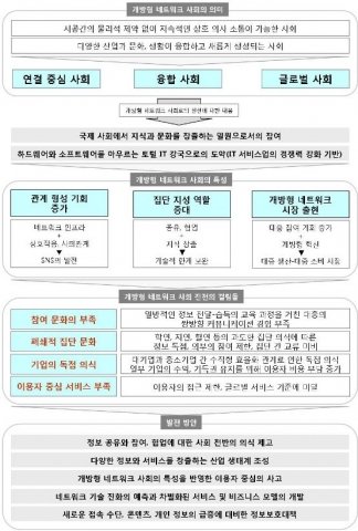 (특징) 개방형 네트워크 사회는 제도 및 기술적 인프라의 조성, 개방 지향적 문화, 대중의 실제 참여를 전제로 하며, ‘연결 중심 사회·융합 사회·글로벌 사회’로의 진전을 특징으로 한다. 한편 기술이 발전하는 만큼 대중은 이에 대한 거부감보다는 기대를 갖고 있으며, 기술에 대한 적응 속도 역시 더욱 빨라지고 있다.