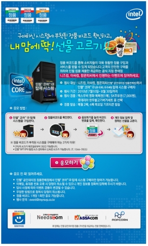 응모방법은 인텔 코어 i3 탑재된 시스템을 구매하고 정품 바코드 및 시스템을 구매한 쇼핑몰에 대한 정보 등을 이벤트 응모란에 남겨주면 응모가 완료된다. 아울러 자신이 원하는 경품을 고를 수 있어 더 큰 재미를 주고 있다