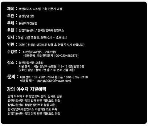 이번 프랜차이즈 시스템 구축 전문가 양성과정은 9월 3일(금요일) 오전 10시부터 오후 5시까지 이루어지며, 20명만 선착순으로 교육등록이 가능하다. 프랜차이즈사업과 운영에 대하여 관심이 있는 분이나, 관련 업계에 종사하는 사람들이라면 한번쯤 등록하는 것도 추천할 만하다 할 수 있겠다.