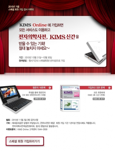이벤트 기간 중에 1년 이상 스페셜회원으로 가입하면 추첨을 통해 16명에게 풀컬러 의학전자사전을, 대상자 전원에게 의약정보집 KIMS 3호를 증정한다.