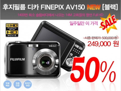 서울--(뉴스와이어)--진정한 소셜커머스를 표방하는 하프스토리(http://www.halfstory.co.kr)는 후지필름 파인픽스 AV150 블랙 디카를 50% 할인된 가격으로 24만 9천원에 공급한다고 17일 밝혔다.