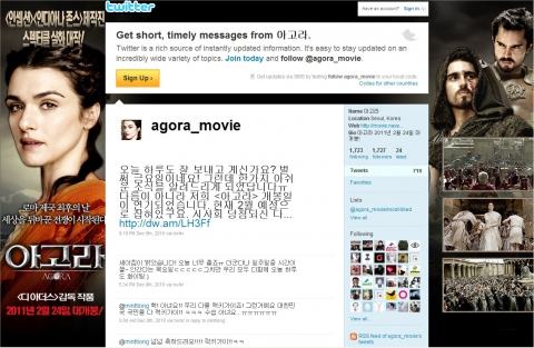 홈페이지에 앞서 오픈된 영화 <아고라>의 공식 트위터(http://twitter.com/agora_movie) 역시 이미 1,700여 명이 넘는 팔로워들을 확보하며 영화에 대한 높은 관심을 증명하고 있다. 영화 <아고라>의 타이틀은 4세기 로마령 이집트 알렉산드리아의 중심에 존재했던 고대 정치와 경제, 종교를 둘러싼 토론이 펼쳐지던 광장을 의미한다. 따라서 아고라 트위터(@agora_movie) 오픈은 사회적 소통을 주도하는 소셜네트워킹 서비스 트위터를 통해 현대판 ‘아고라’의 장을 만들어보고자 하는 취지가 담겨있다. 뿐만 아니라 오픈 기념으로 진행되는 맞팔 이벤트를 비롯해 영화 <아고라>에 담겨있는 역사적 배경을 활용한 ‘진실 혹은 거짓’ 퀴즈 이벤트 등을 통해 각계각층의 트위터리안과의 활발한 소통을 시도할 예정이다.