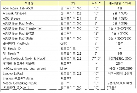 이처럼 시장이 확대됨에 따라, 운영체계(OS) 경쟁도 심화될 것으로 예상되며, 당분간은 먼저 시장을 선점한 아이패드의 iSO와 허니컴(안드로이드3.0)의 양강 경쟁구도를 보일 것으로 전망된다. 또한 OS를 롬(ROM)이 아닌 SD메모리에 탑재하여 언제든 원하는 OS로 변경해 사용할 수 있는 형태도 출시 예정인 것으로 알려지고 있다.
