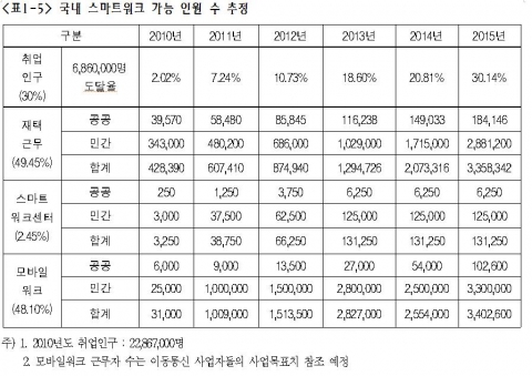 우리나라는 1995년부터 시작된 초고속정보통신망, 광대역통합망, Giga인터넷 구축사업을 통해 전국 기반의 광대역 네트워크 자산을 구축하여 스마트워크 이용 환경을 가장 효율적으로 구현할 수 있는 경쟁력을 가지고 있다. 또한 소통의 방식을 주도하고 있는 스마트폰의 확산과 Wibro, 스마트TV 등 융합형 서비스의 보급, 클라우드 컴퓨팅 관련 기술개발 등도 스마트워크가 활성화 될 수 있는 충분한 환경을 제공하고 있다.