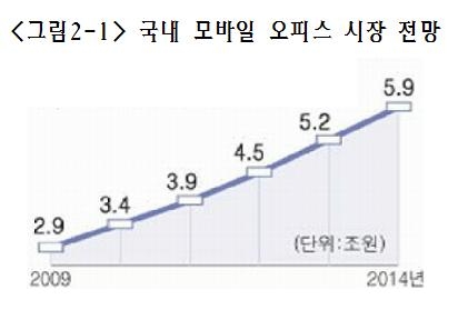 국내의 경우 현재 모바일 오피스를 채택한 기업수가 500여사를 넘고 있고 관련 시장 또한 급속히 성장을 하고 있다. KT경제경영연구소 분석에 따르면 2009년 2조9천억원 수준이었던 국내 모바일 오피스 시장이 2010년에 3조 4천억원, 2011년 3조 9천억원, 2012년 4조 5천억원, 2013년 5조 2천억원, 2014년 5조 9천억원 수준으로 확대될 것으로 추정하고 있다.