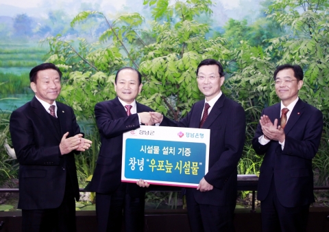 25일 오후 우포늪 생태관을 방문한 박영빈 경남은행장 직무대행은 김충식 창녕군수에게 ‘창녕 우포늪 탐방시설물 기증서’를 전달했다.