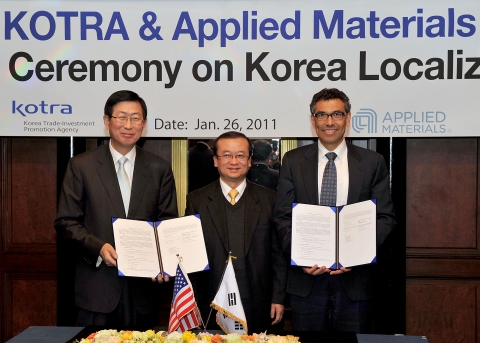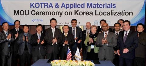 이어서, KOTRA와 AMAT사는 26일 오후 3시 20분 그랜드 인터컨티넨탈 호텔 2층 로터스홀에서 국내 반도체 장비용 부품 소재 기업간의 기술협력 및 부품개발확대에 협력을 위한 MOU를 체결했다. 이날 MOU 체결식에는 KOTRA 조환익 사장, AMAT사 카시오 콘세이카오 부사장, 원동진 지식경제부 부품소재총괄과장 등이 참석했다.