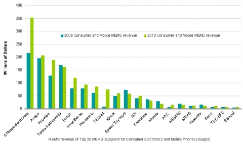 The MEMS consumer market grew 27% in 2010 to US$1.6 billion and similar growth is expected in the next few years, with revenues topping US$3.7 billion by 2014, according to iSuppli. The continued demands from consumer and mobile applications dominate the growth and these fields are expected to become the biggest MEMS segment by 2014.