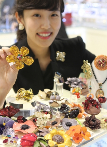 노랑, 연두, 빨강 등 봄을 연상케 하는 컬러와 다양한 꽃 모양의 브로치 등 봄 신상품 액세서리들을 판매한다. 가격은 19만원대부터.