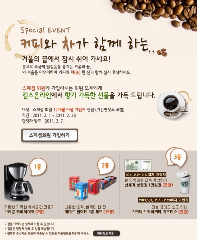 이벤트 기간 내 12개월 이상 스페셜 회원 가입자 전원에게는 총 200만원 상당의 브라운 커피메이커, 아마드 블랙티 세트, 백화점 상품권, 스타벅스 카페라떼의 경품이 차등 증정된다. 특히 설 연휴기간인 2월 2일~6일에 가입하면 최소 1만원 백화점 상품권을 받을 수 있다.