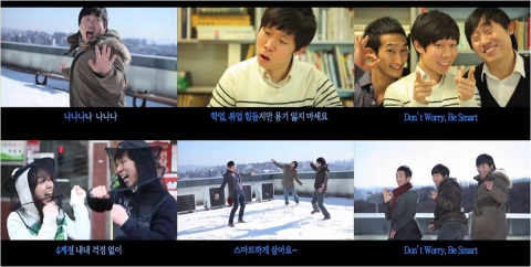 먼저 2011년에는 학업, 취업, 장사 등으로 걱정하지 말고 스마트하게 살자는 희망 메시지 ‘돈워리, 비 스마트’를 통해 많은 네티즌의 공감을 얻고 있다. 특히 학업, 취업에 대해 고민하는 대학생 3인방은 익살스러운 표정과 포즈로 김연아 싱크로율 100%라는 네티즌의 폭발적인 반응을 받았다.