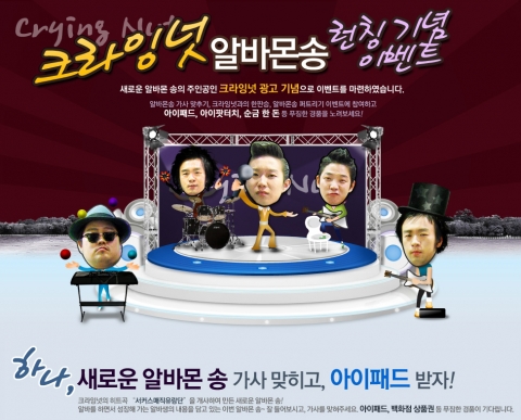 한편 알바몬은 1일 라디오 광고 런칭을 기념하기 위해 개인 및 기업회원을 대상으로 특별 이벤트를 준비했다. 크라잉넛이 직접 부른 새 알바몬송을 들어보고 가사를 맞추면 아이패드 16GB와 백화점 상품권, 음료 기프티쇼 등의 푸짐한 경품을 총 106명에게 선물한다. 또 알바몬 이벤트 페이지에서 크라잉넛 멤버와 가위바위보 플래시 게임을 해서 이기면 순금토끼 한돈, 피자 및 햄버거 등 외식상품 기프티쇼를 111명에게 선물한다. 이외에도 새로 탄생한 알바몬송을 미니블로그를 통해 소문내면 아이팟과 영화예매권, 파리바게뜨 기프티쇼 등의 풍성한 경품이 주어진다.