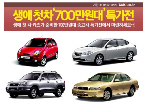 중고차사이트 카즈(http://www.carz.co.kr)가 생애 첫 차를 경제적인 가격에 구입하고자 하는 이들을 위한 노련미를 갖춘 700만원대 중고차 특가전을 준비했다. 신차 시장에서도 꾸준한 인기를 모으는 모델들 중 엄선된 인기 차량들이 그 대상이다.