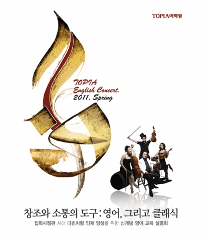 토피아어학원 관계자는 “음악을 도구로 창의적인 클래식 컨텐츠를 만들어 소통하는 콰르텟 엑스는 영어를 도구로 세상을 향해 자신의 생각을 소통하는 아이들로 키우겠다는 토피아의 교육철학과 닿아있다” 면서 “폭 넓은 지식과 경험이 담긴 창의적 컨텐츠로 세상과 소통한다는 점에서 ‘영어와 클래식’이란 소재가 너무나 닮아있다. 다른 듯 닮아 있는 두 소재를 통해 입학사정관 시대가 원하는 새로운 인재상에 대한 해답을 제시하는 장이 될 것”이라고 밝혔다.