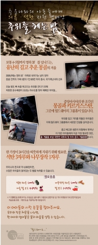 뼛속을 파고드는 추위를 견디기 위해 따스한 온수배관이 흐르는 하수도를 찾아 헤매던 아이들과 월드쉐어 사업장 인근 빈민가정의 추위를 녹여 줄 석탄과 나무장작 등 난방연료로 지원 될 예정이다.